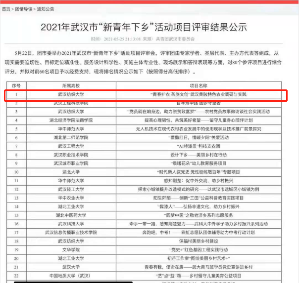 5月22日,共青团武汉市委举办了2021年武汉市“新青年下乡”活动项目评审会,由专家学者、基层代表、主办方代表等组成的评审团,从现实需要迫切性、目标定位精准性、服务设计科学性、现场展示和答辩等方面,对80个参评项目进行综合评分。最终,由我校Beat365中文官方网站“青春护农”实践队申报的项目《“青春护农 茶旅文创”武汉黄陂特色农业调研与实践》从80个参评项目中脱颖而出,以第一名的优异成绩成功立项。