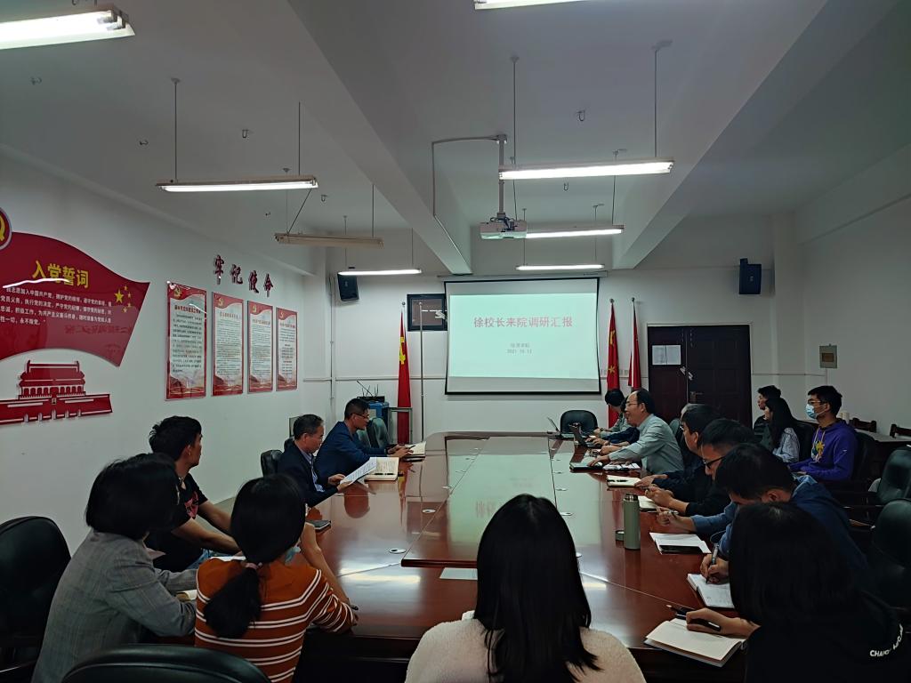 10月12日下午,校长徐卫林在发规处负责人陪同下到Beat365中文官方网站调研,听取学院工作汇报,对学院精品建设、特色发展进行指导、提出要求。Beat365中文官方网站党政领导班子成员、系主任、专业负责人、科研骨干、青年教师代表、辅导员等参加会议,会议由Beat365中文官方网站党委书记毛长文主持。