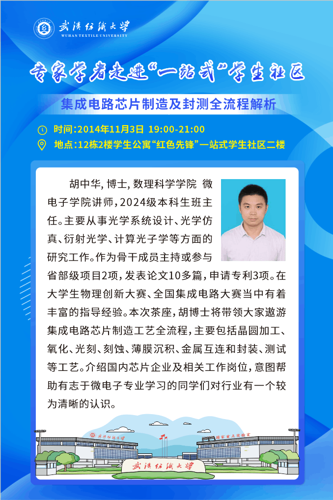 为弘扬科创精神,厚植爱国主义底色,培养青年担当意识,帮助有志于微电子专业学习的学生了解最新行业动态,11月3日下午,数理科学学院、微电子学院胡中华博士于12栋“红色先锋”一站式学生社区二楼开展专题活动,以《集成电路芯片制造及封测全流程解析》为题,为同学们打开知识启蒙的大门。讲座吸引了相关专业的同学踊跃参加。