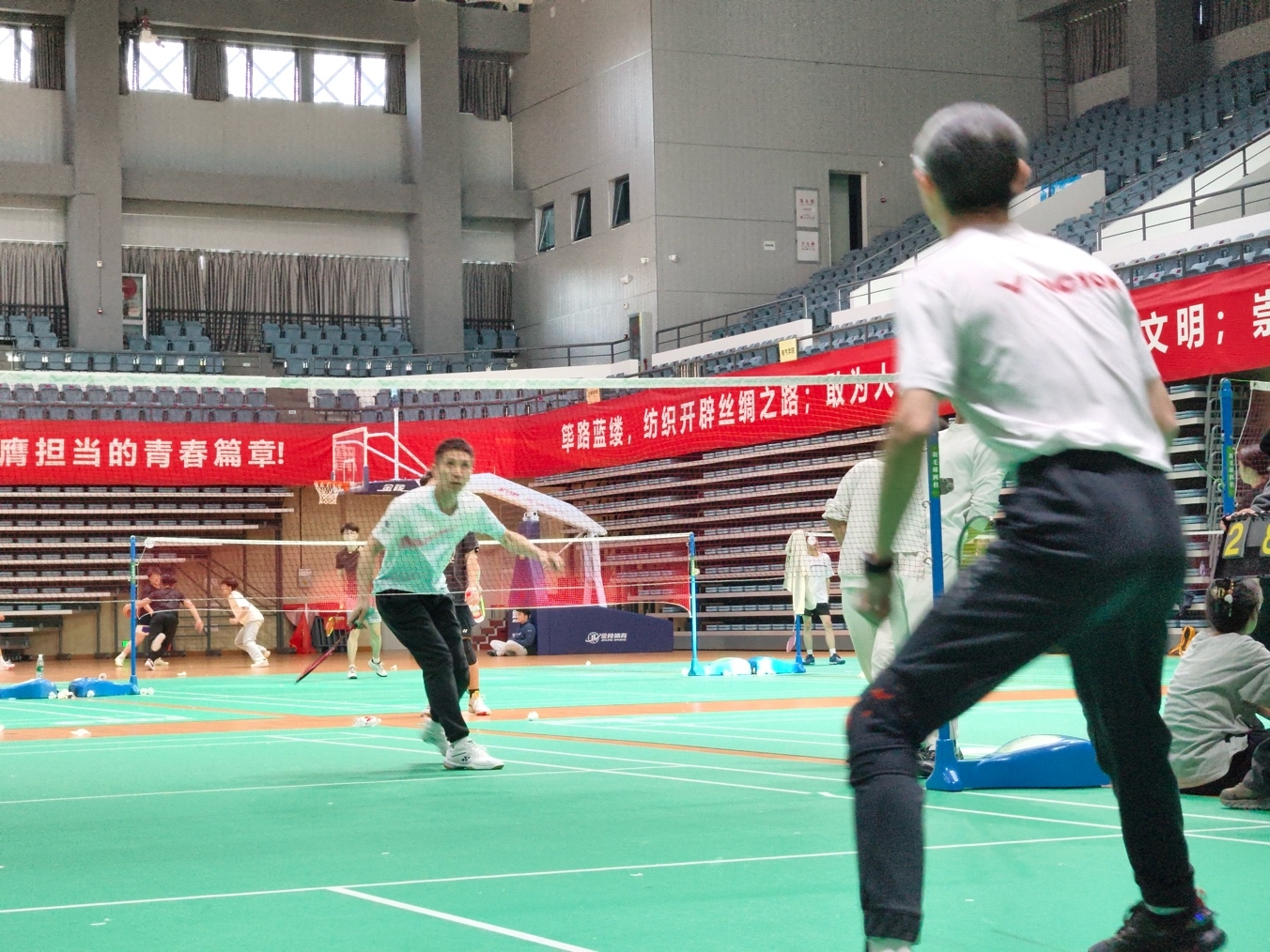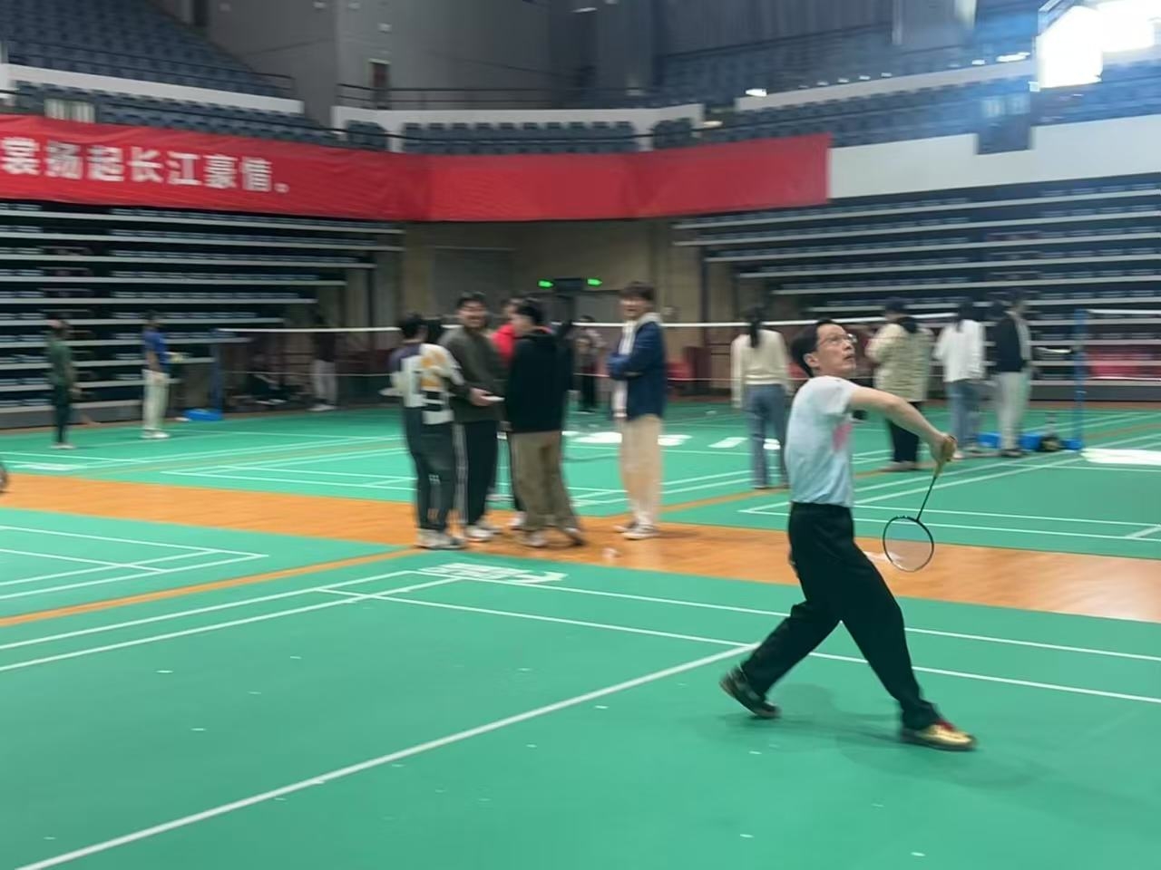 比赛中,师生们精神饱满、斗志昂扬,充分展示了良好的体育素养和团队合作精神。比赛现场,他们激烈角逐,时而挥拍扣杀,时而巧妙救球,精湛的技术和出色的表现赢得了观众们的阵阵掌声。随着比赛的深入,选手们的体力和意志都受到了极大的考验。汗水浸湿了他们的运动服,但他们的眼神依旧坚毅。每一次得分后的握拳庆祝,每一次失分后的深呼吸调整,都展现了选手们的专业素养和不屈不挠的精神。