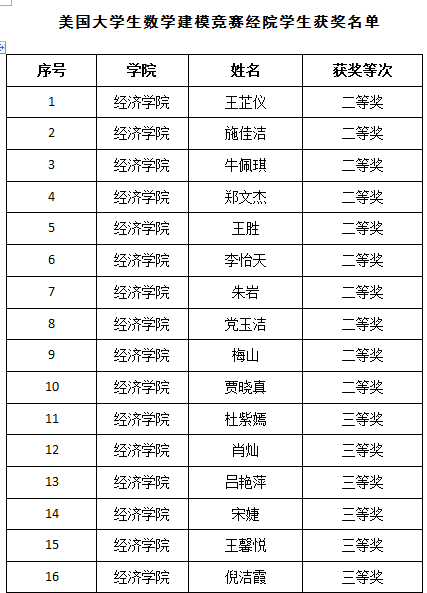 2018年美国大学生数学建模竞赛(MCM/ICM)成绩于近日揭晓,Beat365中文官方网站选派的16名学生(全校共54名学生参赛)中,其中10人荣获二等奖、6人荣获三等奖。比赛成绩创学院参赛以来最佳成绩,其中获奖人次位居全校各学院第2位、文科学院第1位。