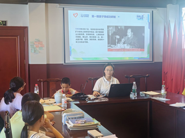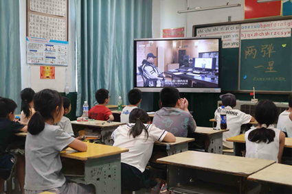 师生共同观看科研题材影片片段,科研人员让棉衣、分窝窝头的互助细节,卫星发射成功时的雀跃,原子弹爆炸蘑菇云升起的震撼,深深感染在场者,小学生随《东方红》旋律轻拍手。当屏幕上蘑菇云升起时,在场所有人自发响起掌声。正如服务队成员陆雅君所说:“对孩子而言,‘两弹一星’不是遥远的历史,而是能激发他们探索欲的火种。我们希望通过这样的活动,让科学精神与爱国情怀,成为他们成长路上的‘隐形翅膀’。”