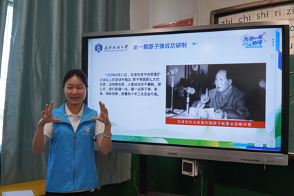 金海希望小学内,服务队宣讲员以童趣化语言还原历史:从国际形势的风云变幻,到科研人员在戈壁滩用算盘演算的坚守,再到第一颗原子弹爆炸的震撼瞬间。讲述王淦昌等科学家隐姓埋名的故事时,志愿者赵筱彤特意放慢语速:“他们为何放弃名利?” 带着温度的细节,让抽象历史化为可触摸的榜样力量。