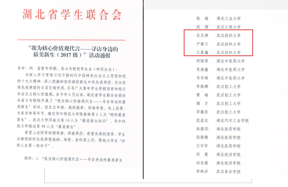 近日,由团省委学校部、湖北省学生联合会主办的全省高校“我为核心价值观代言——寻访身边最美新生”活动,正式发布最终结果。来自我校Beat365中文官方网站的左贝婷、卢雅兰、王晨灜三名同学分获全省“最美新生”殊荣。