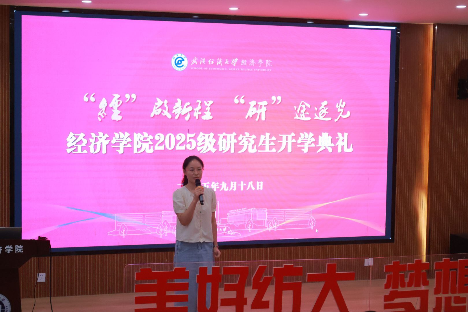 金融专硕研2521班研究生代孟欣作为新生代表发言。她对学校及师长的关怀帮助表达诚挚感谢,并表示将珍惜在纺大的学习机会,秉承“崇真尚美 笃行致远”的校训精神,以积极踏实的态度投身专业学习与科研实践,努力成长为兼具专业素养与创新能力的时代新人。她的分享充满了对未来的憧憬和信心,也展现了新生的朝气和活力。