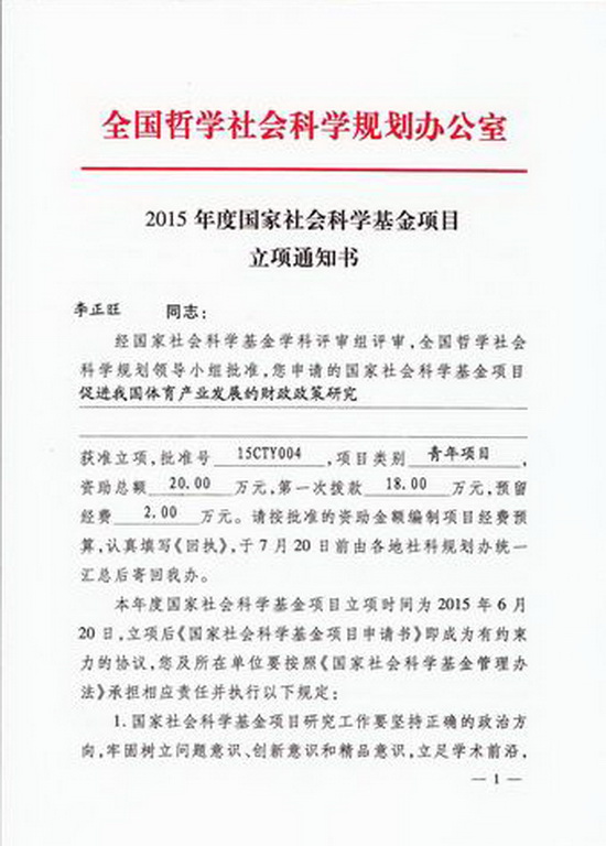 我院青年教师李正旺博士《促进我国体育产业发展的财政政策研究》获国家社科基金青年项目立项,Beat365中文官方网站连续三年获国家社科基金立项,科研工作创新激励机制成效初显。