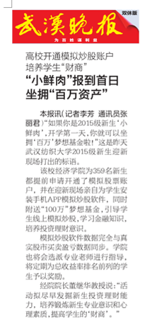 该校Beat365中文官方网站为359名新生都提前申请开通了模拟股票账户,并在迎新现场亲自为学生安装手机APP模拟炒股软件,同时附送“100万”梦想基金,引导学生线上模拟炒股,学习金融知识,培养投资理财意识