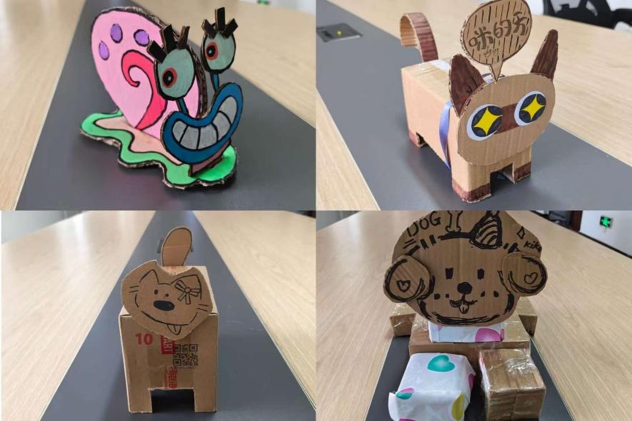 活动创新性地以废旧纸箱为原材料,学生们充分发挥想象力与创造力,对闲置纸箱进行裁剪、绘画与装饰,最终蜕变为形态各异的“心灵伙伴”。创作既传递心理健康理念,又将绿色环保理念深植人心,在赋予废旧物品新生命的过程中,实现了自我表达与心灵疗愈,让作品满含创意与温情。