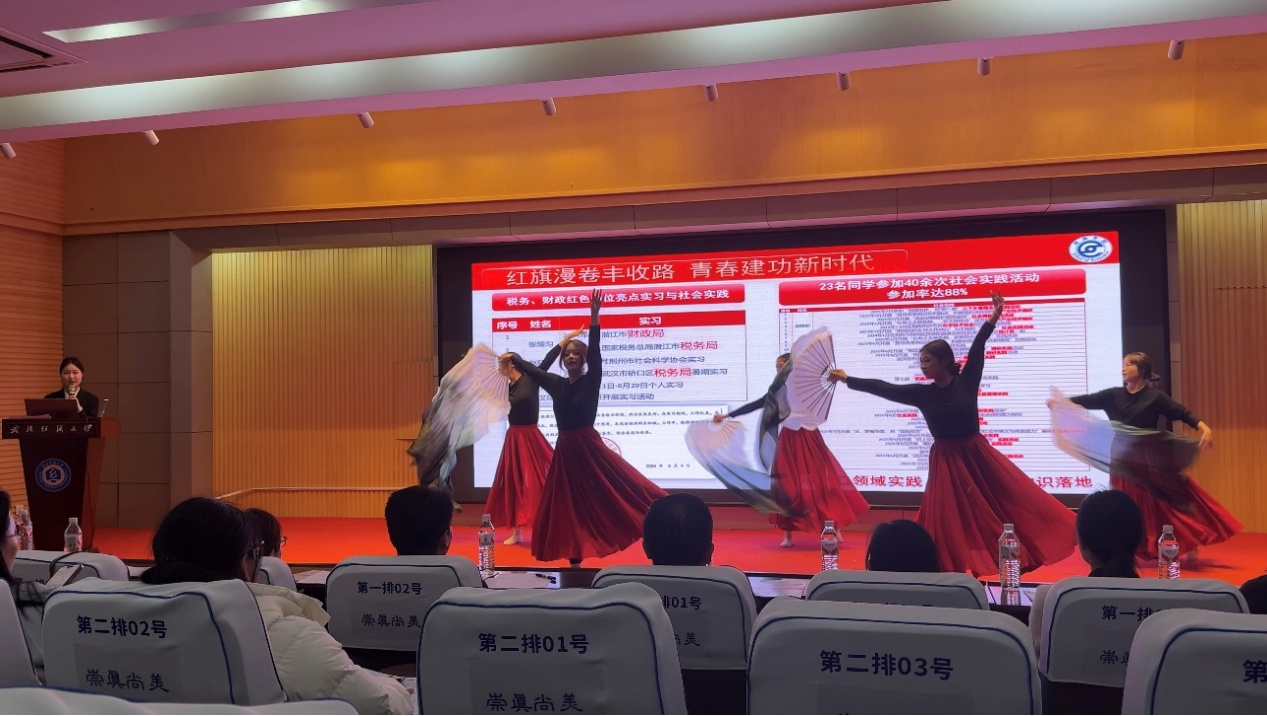 税收12302班秉持“红脉铸魂,税兴中华”的班级建设核心理念,以扎实的数据和案例,阐述了班级成员在思想引领、学风建设、科研创新与社会实践等方面取得的突出成绩,形成了积极健康、知行合一的良好氛围。汇报别出心裁地融入了舞蹈片段,将专业学习的严谨与青春生命的活力创造性结合,瞬间抓住了全场观众的注意力,生动诠释了班级成员全面发展的特质。