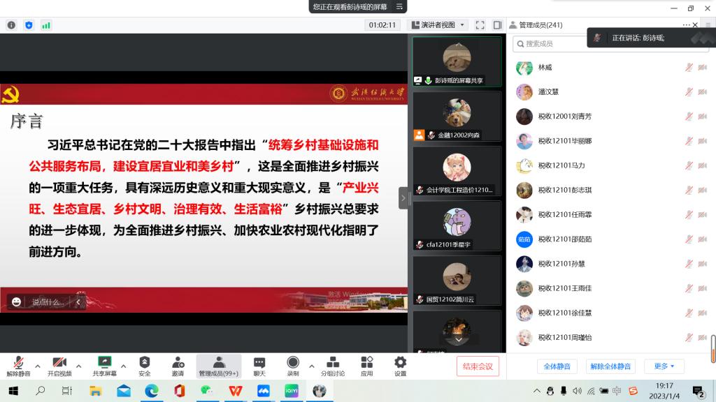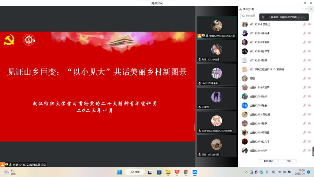为进一步组织引导广大青年学生深入学习宣传贯彻党的二十大精神,坚定跟党走、建功新时代。根据《Beat365中文官方网站学习贯彻党的二十大精神宣讲工作方案》部署要求,1月5日晚,学校青年宣讲团第六分团深入Beat365中文官方网站、会计学院,通过腾讯会议线上平台面向两院青年学子开展党的二十大精神专场宣讲报告会,近300名青年师生参加报告会。