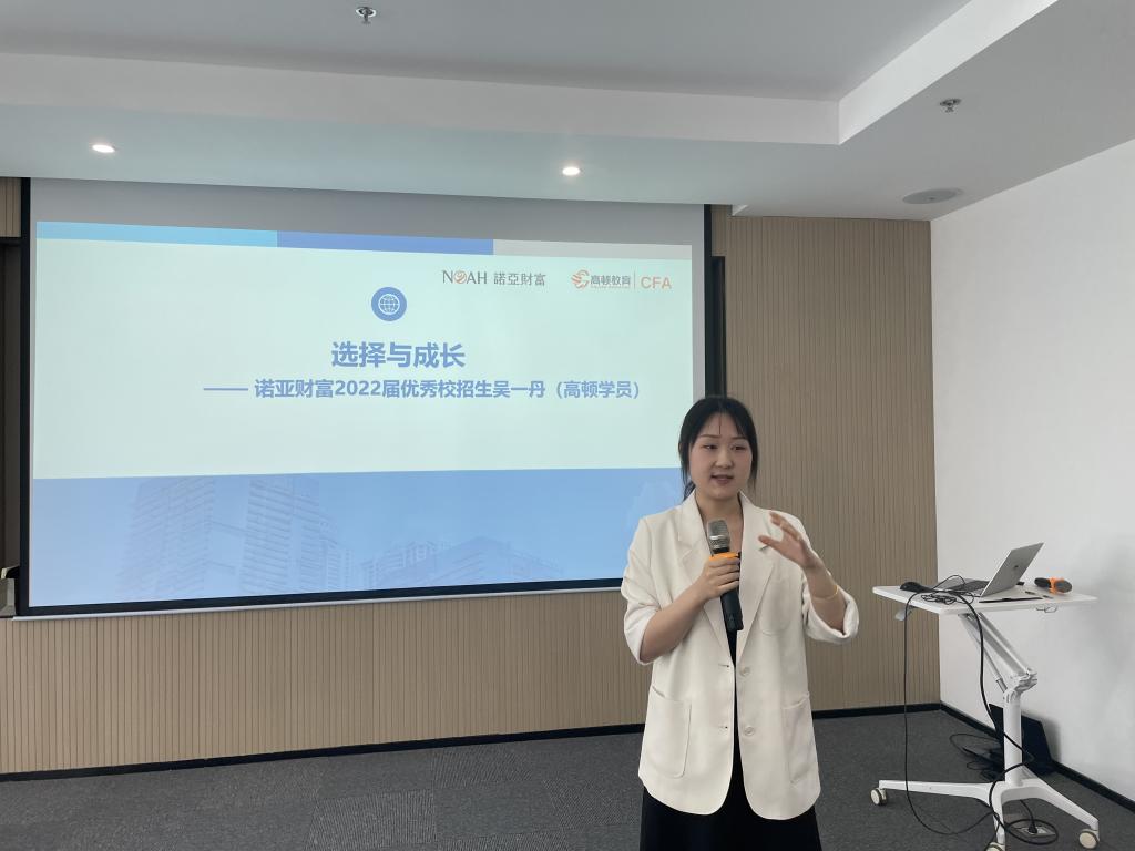诺亚财富湖北区优秀校招生吴一丹带着学生们去参观了诺亚财富的员工办公区、获奖展览室和接待区,让同学们对诺亚财富有了初步的了解。诺亚财富公司中西大区武汉片区产品总监文静向同学们介绍金融行业、诺亚财富的公司背景、部门架构等,并向同学们提出有关择业的一些建议。高顿教育优秀学员内推诺亚财富的优秀校招生吴一丹进行职业选择和个人成长分享。在接下来的自由交流与互动环节,纺大学生踊跃提问,现场气氛活跃热烈。