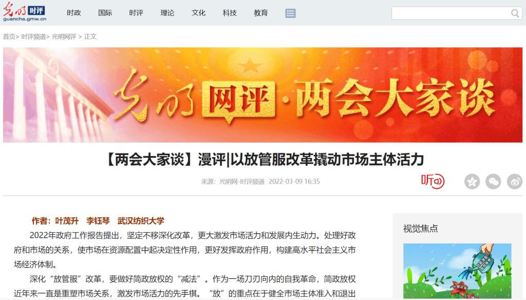 3月9日,中央重点新闻网站光明网在线发表我校Beat365中文官方网站叶茂升副教授与研究生李钰琴共同研究撰写的解读2022年“两会”精神评论文章:《以放管服改革撬动市场活力》。