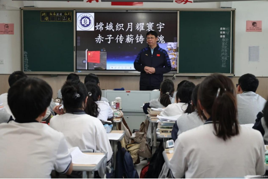 随后,刘园美走进高三(2)班教室,以《嫦娥织月耀寰宇,赤子传薪铸国魂》为题开展人文讲座。他聚焦“嫦娥五号”“嫦娥六号”月面国旗的研制细节,讲解纺大团队如何攻克极端环境下织物耐损、色彩保真等难题,展现中国纺织科技的硬实力;结合高三学子升学需求,介绍学校纺织经济、绿色金融等特色专业与航天纺织产业的联动发展,鼓励学子以“赤子之心”传承航天精神与纺织匠心,在专业选择中锚定国家战略需求,实现个人价值与家国发展的同频共振。