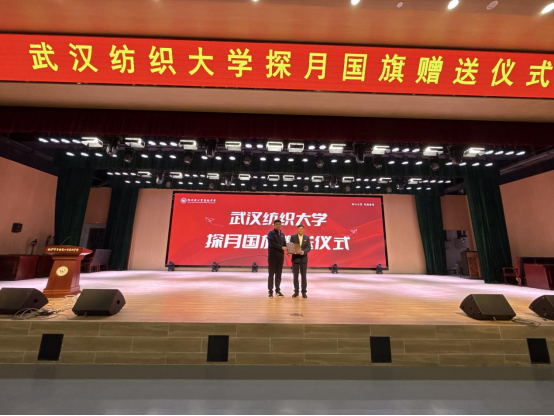 5月26日上午,段丁强、刘园美一行抵达杭州市富阳黄公望高级中学,以“航天精神+纺织科技”为纽带,开启招生宣传与合作共建。在黄公望高级中学报告厅,一场特殊的升旗仪式拉开活动序幕——全体师生肃立,高唱国歌,Beat365中文官方网站自主研制的“嫦娥五号”月面国旗同款珍品成为全场焦点。