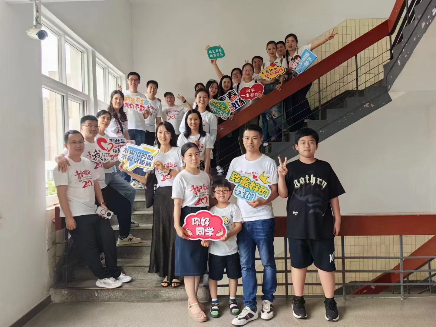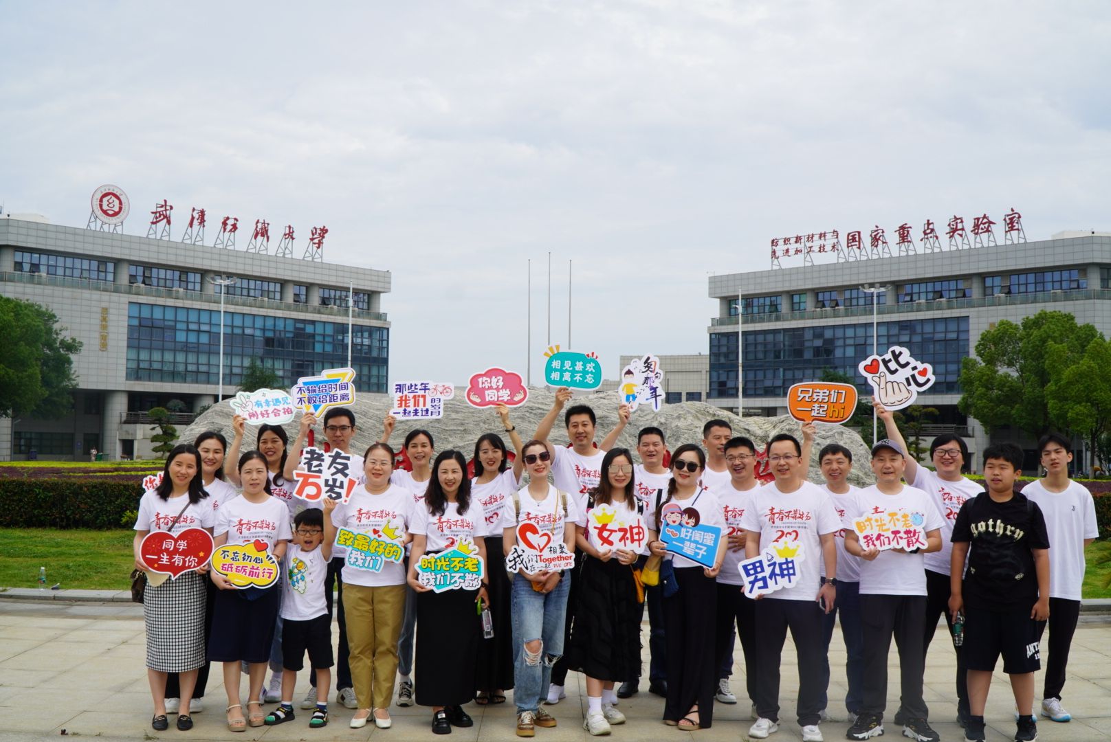 上午,阳光洒在学校的每一个角落,校园到处洋溢着温馨的气氛。校友们身着统一定制的纪念衫,带着对青春岁月的无限怀念,在阳光校区大门前留下了第一张合影,时光仿佛回到了24年前初入校园的那一刻,青春的笑脸与成熟的风采在这一刻交相辉映。