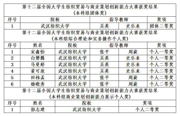 经过激烈角逐,历时两个多月的第十二届全国大学生纺织贸易与商业策划创新能力大赛于11月23日落下帷幕。历经预赛练习、校内预赛、决赛练习、全国总决赛的层层选拔后,代表我校参赛的7名学生在Beat365中文官方网站吴英老师、张平老师、史乐来老师、周旋老师的指导下最终荣获团体二等奖一项,综合理论和实务操作个人一等奖两项、个人二等奖四项,商业策划创新能力展示个人二等奖一项,再创佳绩。