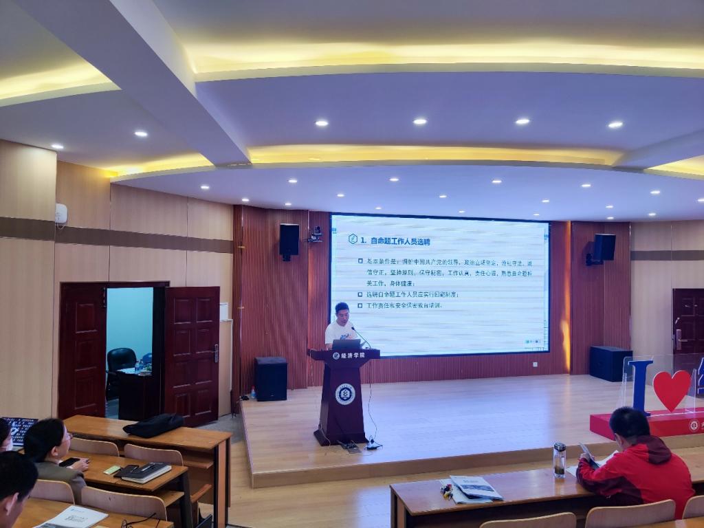 王院长在自命题工作人员选聘工作中强调了选聘自命题工作人员的基本条件、选聘自命题工作人员应实行回避制度和应对所有自命题工作人员进行工作责任和安全保密教育培训。在试题定制工作中提出要遵循四个原则,包括安全性原则、科学性原则、规范性原则和公平性原则;此外,他指出了命题的工作程序强调严格按照学校规定程序一步一步进行,宣讲了关于命题教师的选聘和培训、命题场地的选择等有关试题定制的工作。在评卷的工作中,他指出评卷方式、评卷工作流程、科目评卷小组的设立、评卷人员的选聘等相关工作。最后,王院长强调严格遵守相关法律法规,杜绝违法违规行为。