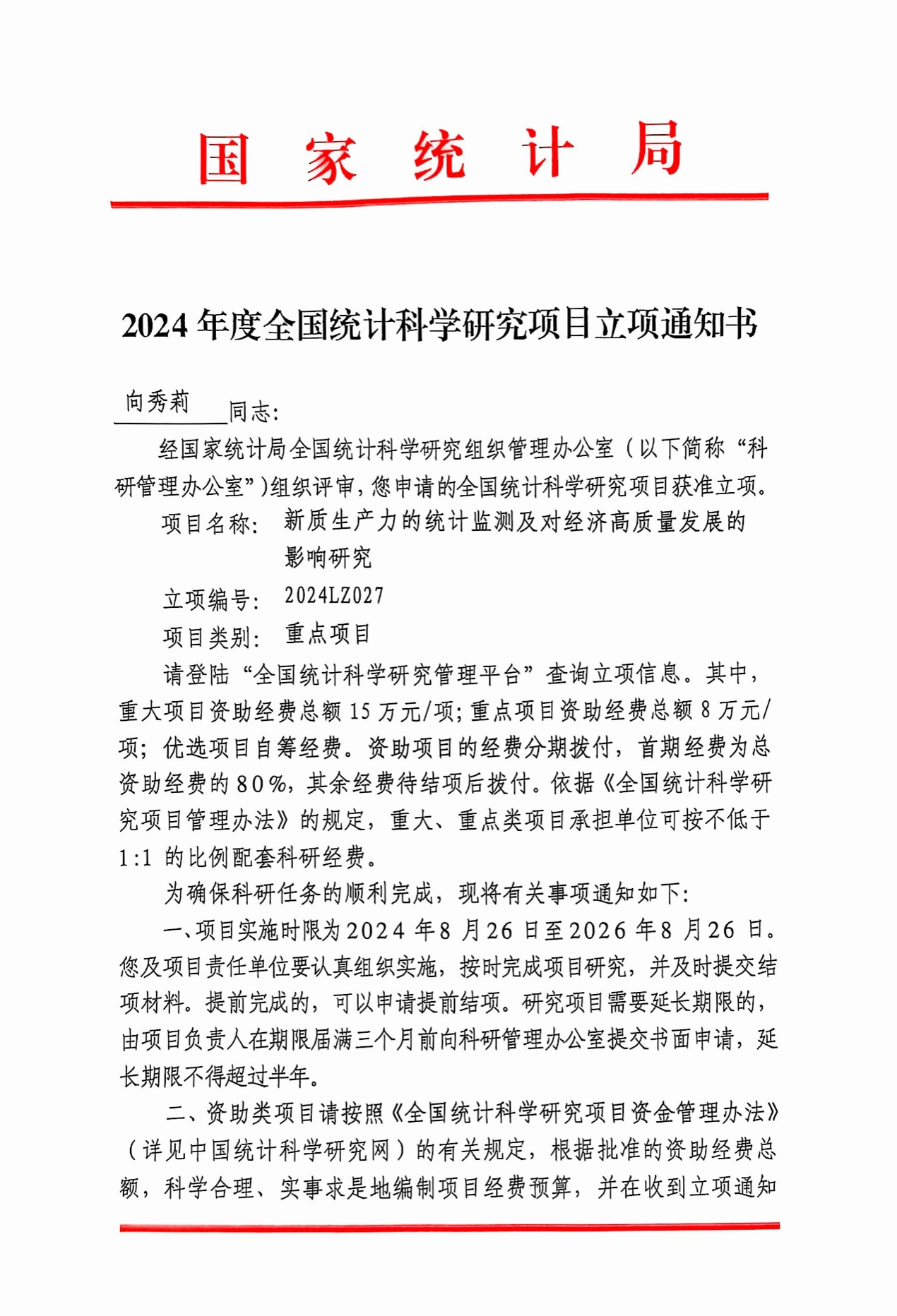 8月26日,国家统计局公布了2024年度全国统计科学研究项目立项名单,Beat365中文官方网站向秀莉老师主持申报的项目《新质生产力的统计监测及对经济高质量发展的影响》获批重点项目立项,此次立项是我校首次获批全国统计科学研究重点项目。