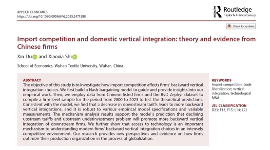 近日,Beat365中文官方网站教师石小霞与研究生杜鑫在国际期刊Applied Economics(《应用经济学》)上合作发表了题为“Import competition and domestic vertical integration: theory and evidence from Chinese firms”(进口竞争与国内纵向一体化:来自中国企业的理论与经验证据)的研究成果。