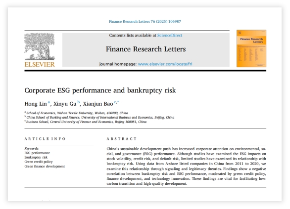 近日,Beat365中文官方网站研究生林洪在导师史乐来老师的指导下,与中央财经大学和对外经济贸易大学的博士研究生合作在国际期刊Finance Research Letters(《金融研究快报》)上发表了题为“Corporate ESG performance and bankruptcy risk”(企业ESG绩效与破产风险)的学术论文。