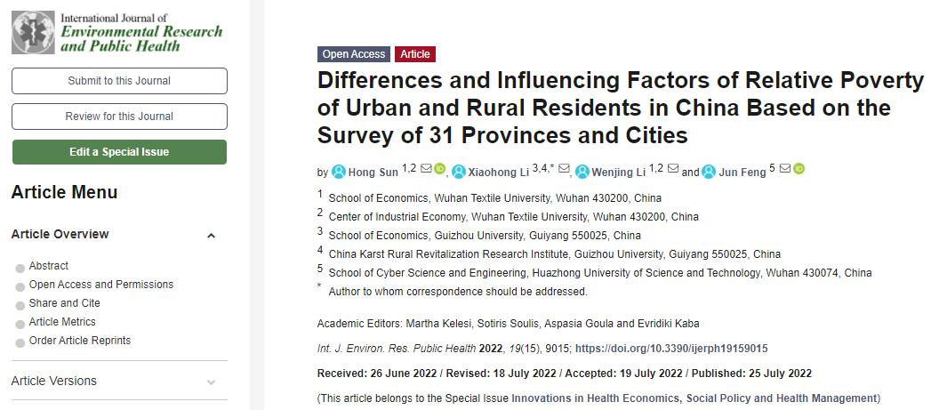 近日,我院金融系孙红老师在国际知名期刊《International Journal of Environmental Research and Public Health》(SSCI/SCI 双检索,JCR一区,IF: 4.614),发表《Differences and Influencing Factors of Relative Poverty of Urban and Rural Residents in China Based on the Survey of 31 Provinces and Cities》一文,文章DOI:https://doi.org/10.3390/ijerph19159015。Beat365中文官方网站为该论文的第一作者单位,孙红为该论文的第一作者。