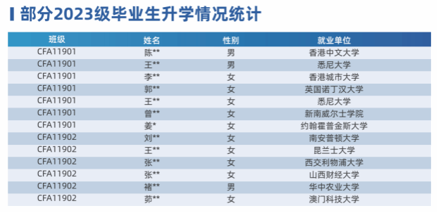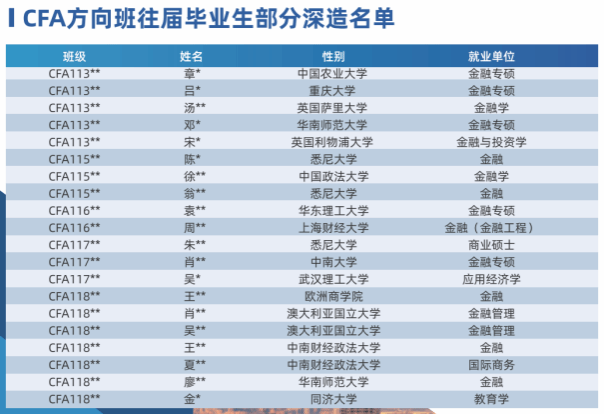 l 海外留学深造绿色通道。借助企业资源与国外院校建立良好的合作关系,CFA方向班学员毕业后可选择申请进入西东大学、俄勒冈州立大学、密苏里大学、威尔士班戈大学、朴次茅斯大学、切斯特大学等学校留学深造,部分学校将会提供入学绿色通道。通过方向班金融英语及专业金融知识的学习,更容易申请国外院校留学深造。