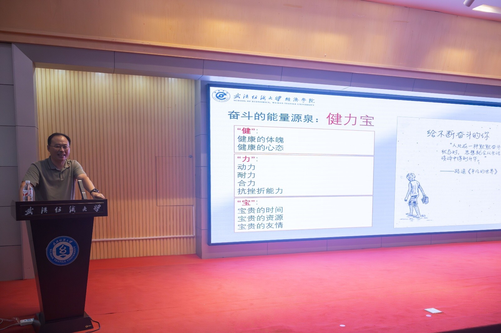 最后,段丁强以“奋斗的能量源泉:健力宝”为比喻,为新生送上成长寄语:“健”,即拥有健康的体魄与积极的心态;“力”,即锤炼前进动力、持久耐力、团队合力与抗挫折能力;“宝”,即珍惜宝贵的大学时光、优质资源与真挚友情。