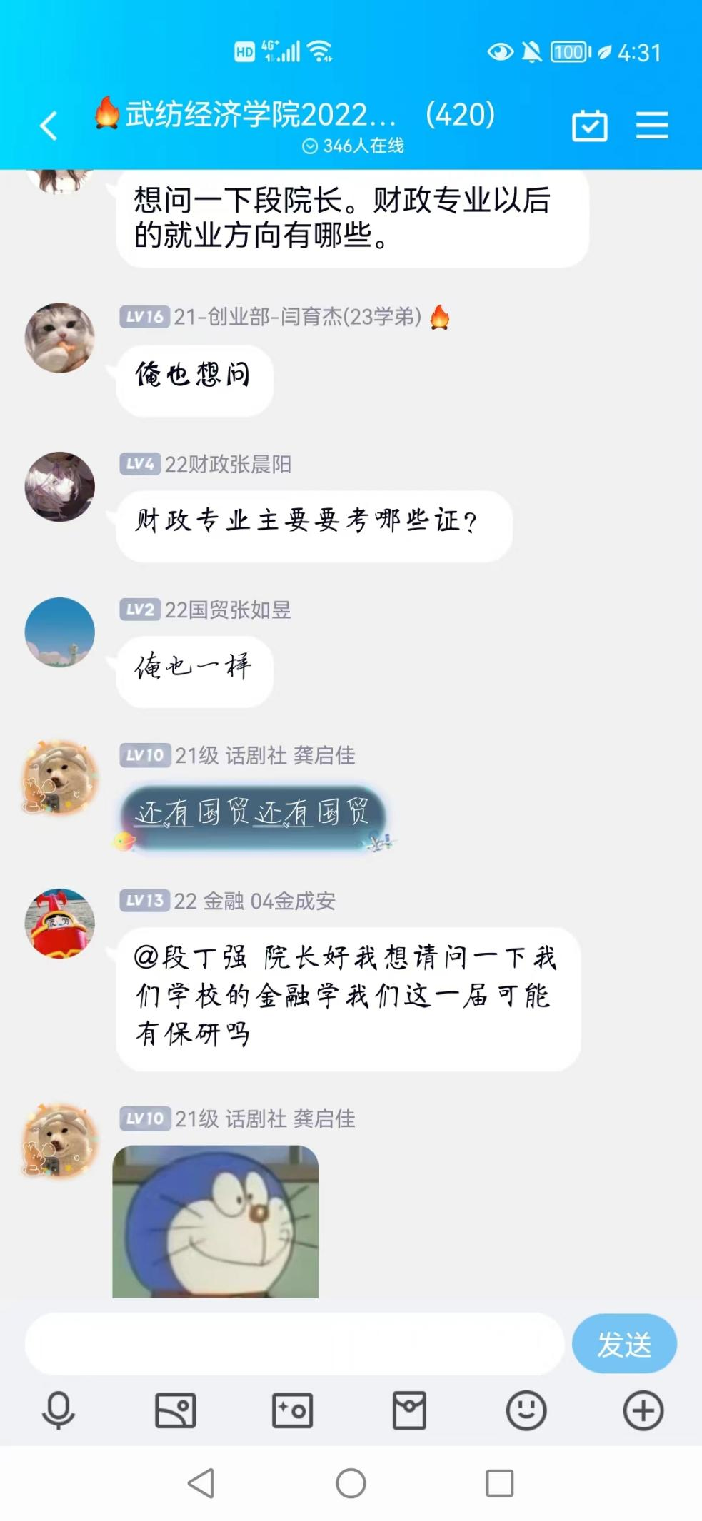 聚焦“学科建设介绍”“学院各系各专业介绍”“推优入党、组织关系档案转接”“求学考研经验分享”等相关问题,8月22日晚起,院长段丁强、金融系系主任毛莹等在线上开展了一场场别开生面的“新生答疑课”。“金融专业适合哪些公务员岗位”,“国贸专业还要考会计证和其他证件吗”,“学校会有大型企业特聘吗”,“金融专业课外的学习任务重吗”,“团组织关系转接必须要有介绍信吗”,还未入学的新生热情高涨,在新生QQ群中提问的热火朝天。针对学生们的问题,段丁强院长等耐心解答、娓娓道来,学生们认真倾听,纷纷表示受益良多。