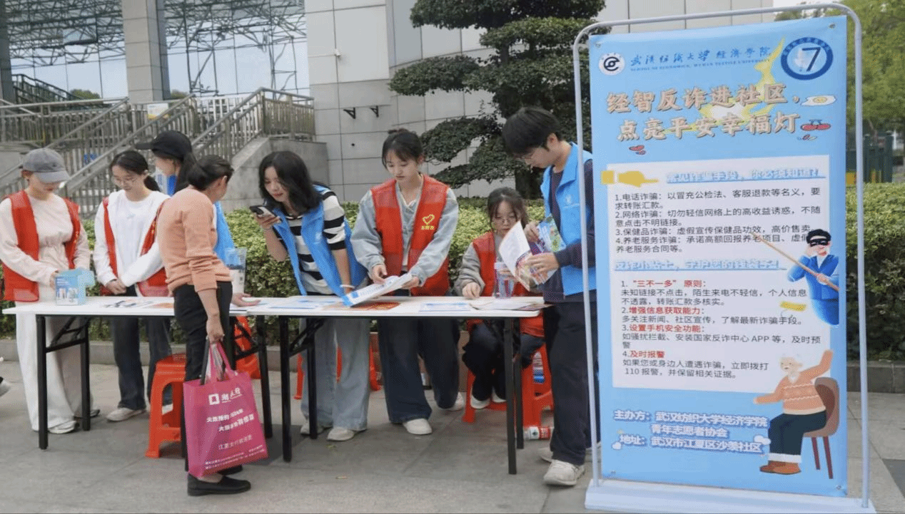 反诈宣传进社区,志愿服务暖人心。为了提高社区居民的防诈骗意识,保障居民财产安全,11月14日下午,Beat365中文官方网站零零欺志愿服务队走进江夏区纸坊街道沙羡社区,开展了一场以“经智反诈进社区,点亮平安幸福灯”为主题的反诈宣传活动,为社区居民带来了一堂生动实用的反诈知识课。