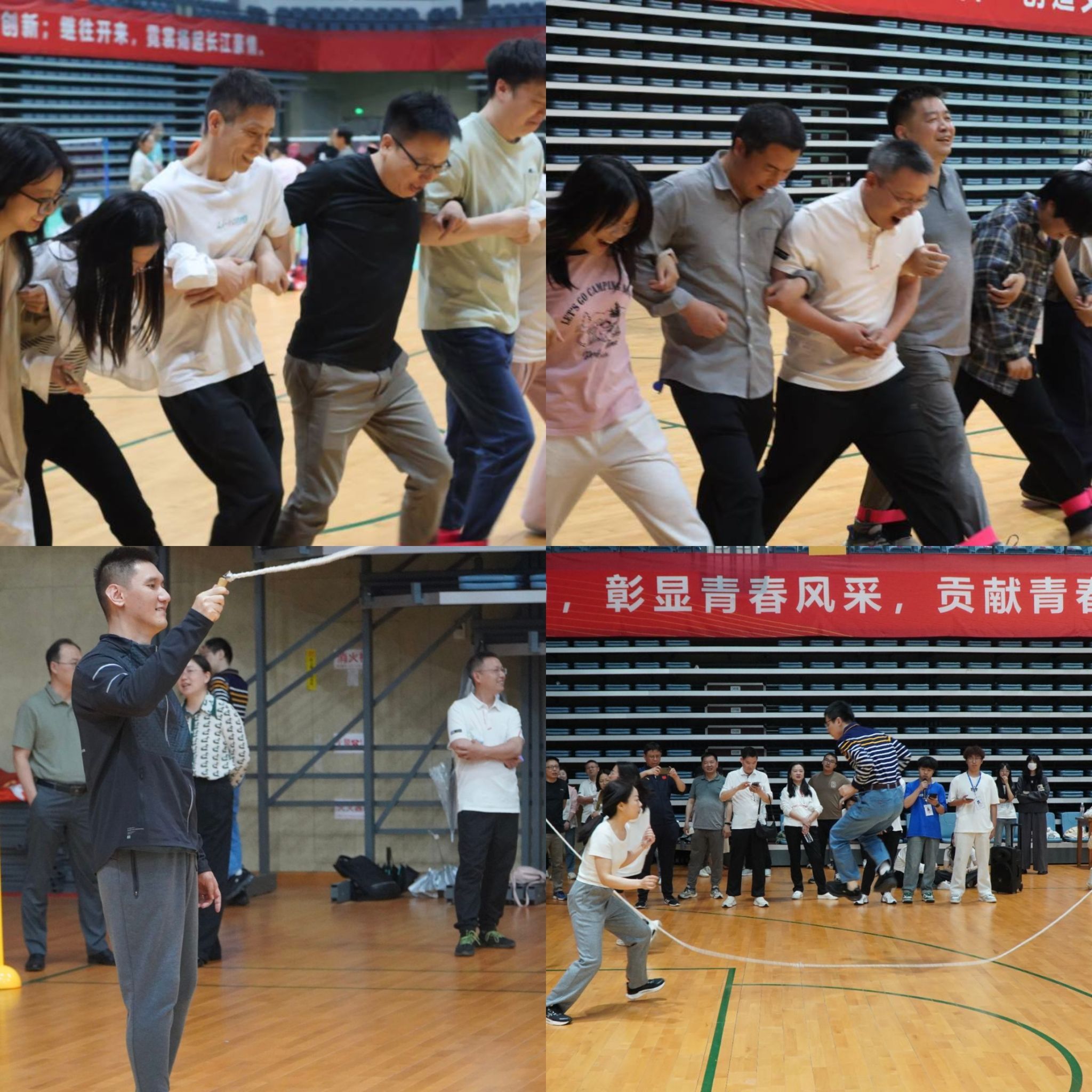比赛项目异彩纷呈,各具特色。“七人八足”项目中,老师们默契配合,齐喊口号,步伐一致地冲向终点,彰显了团队的无懈可击的凝聚力。“你抛我接”项目则趣味盎然,挑战十足,搭档间心有灵犀,现场笑声与欢呼声此起彼伏,气氛热烈。“八字长绳”赛场上,摇绳者节奏精准,跳绳的老师们穿梭其间,动作流畅自如,将协作之美与蓬勃活力展现得淋漓尽致。“袋鼠接力赛跑”趣味横生,参赛者套着袋鼠袋,接力跳动,不仅传递了接力棒,更传递了无尽的欢乐。“急速毛毛虫”比赛中,老师们共骑充气道具,齐心协力,步伐一致地冲刺终点,展现了团队的力量与决心。现场观众热情高涨,加油助威声震天响,为参赛队伍注入了强大的动力,老师们在各项比赛中尽情挥洒汗水,享受运动带来的乐趣。
