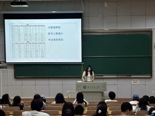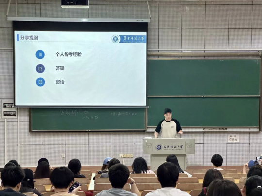 会上,考研上岸的喻洲林、张黄绮结合个人备考经历,针对英语、政治、专业课三个考研科目的学习方法进行分享:英语方面,要利用碎片时间进行词汇积累并保持阅读练习;政治方面,要关注时事热点,结合大纲复习;专业课方面,要利用好网课资源,有针对性地复习。喻洲林表示,考研是一场持久战,需要坚定的信念、科学的方法和良好的心态,在复习过程中,要注重基础知识的积累,同时也要加强模拟训练,提高应试能力。针对择校问题,张黄绮建议同学们要结合自身兴趣、实力和未来发展规划进行综合考虑,她提醒同学们要根据自己的兴趣和职业规划,合理选择考研目标,并制定科学合理的复习计划。