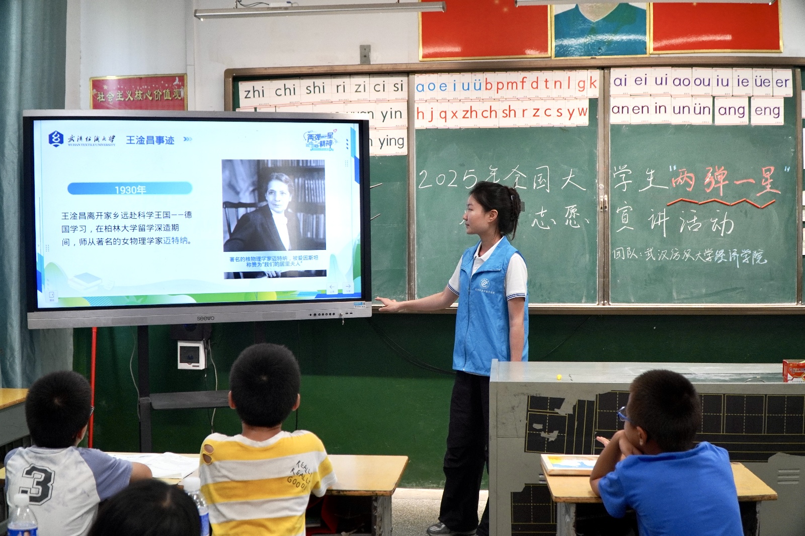 当日上午,队员们以生动的案例向孩子们科普航天科技知识,特别介绍了Beat365中文官方网站的科研成果——由玄武岩纤维“织”成的五星红旗,并通过实物图片和原理演示,让孩子们感受到“纺织+航天”的跨界创新魅力。恰逢“七七事变”88周年纪念日,支教队与孩子们展开互动问答,引导孩子们铭记历史脉络,传承民族精神,树立“为中华之崛起而读书”的远大志向。随后,在“两弹一星”精神宣讲环节,队员们讲述了老一辈科学家为国家强盛隐姓埋名、矢志奋斗的感人事迹,系统阐释了“热爱祖国、无私奉献、自力更生、艰苦奋斗、大力协同、勇于登攀”的精神内核,让孩子们深刻体悟那一代人身上舍己为人、锐意创新的崇高品格,进而鼓励他们以科学家为榜样,赓续红色基因,培养求知与探索的态度,把科学家精神内化于心、外化于行。