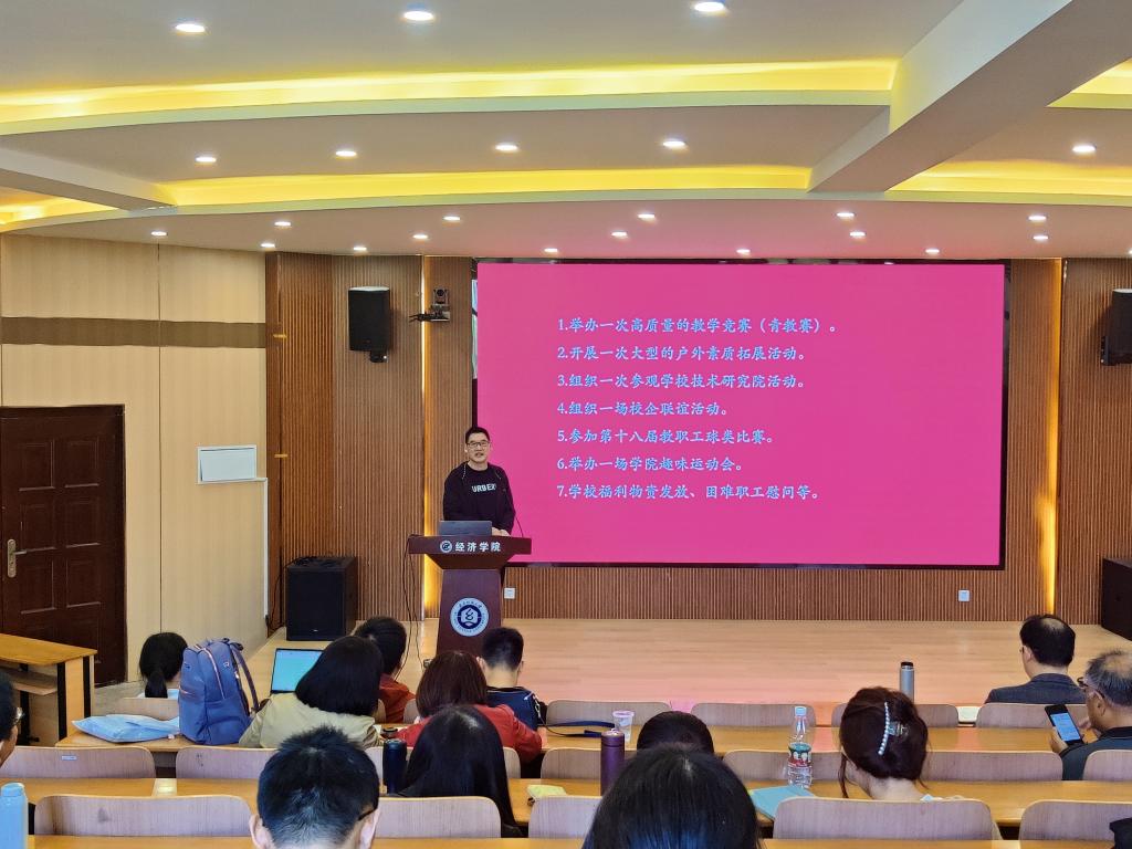 会上,朱云峰传达了学校2023年工会工作安排和工会经费使用指南,与教职工分享了今年学院工会工作的重点内容,即举办一次高质量的教学竞赛、开展一次大型的户外素质拓展、组织一次参观学校技术研究院、组织一场校企联谊、积极繁荣教职工文体活动、做好教职工福利等工作。